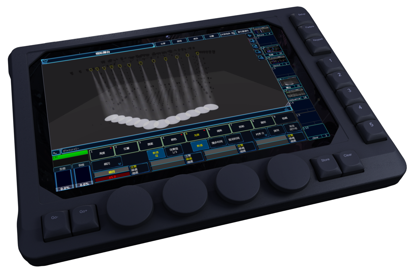 It can completely imitate the real stage rendering effects, such as Gobo revolution/rotation, framing, frost, iris, color, and so on. The clear layout can bright a true stage to the user